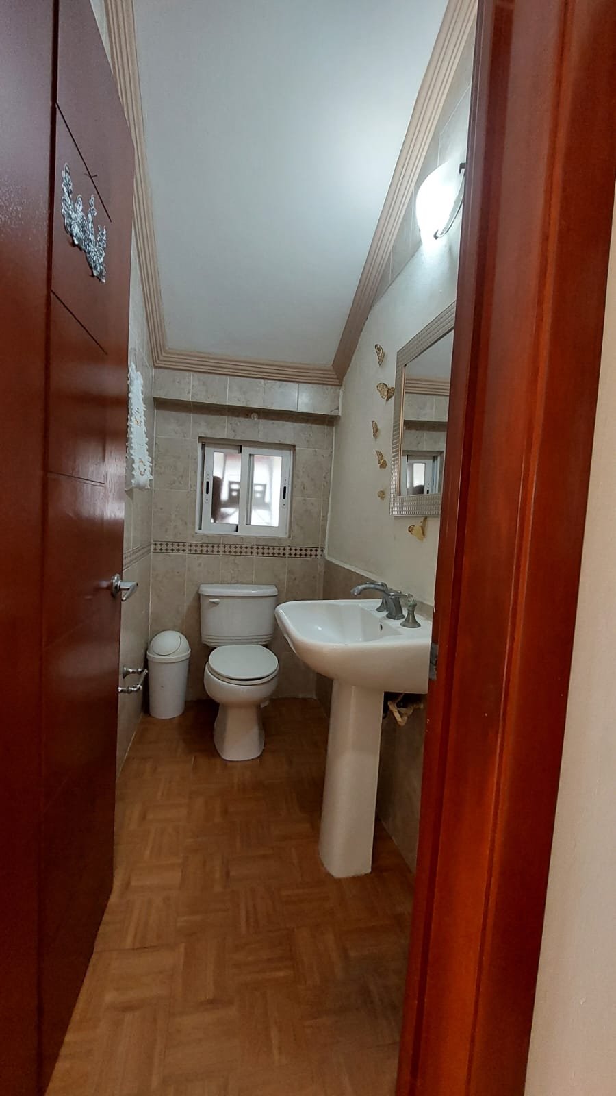 El medio baño en planta baja resuelve el uso social de la casa con la discreción que se espera cuando hay visitas, nadie tiene que subir al área privada de la familia para encontrar un sanitario.