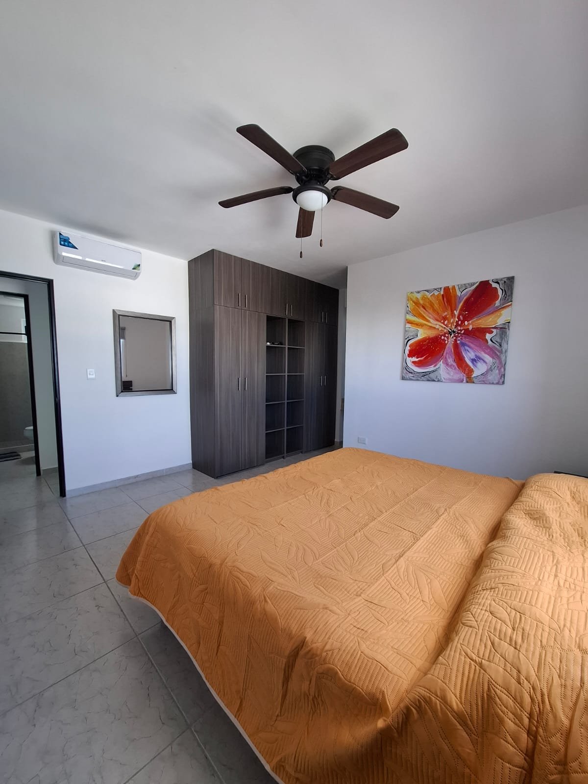En el piso 7, la recámara principal recibe una calidad de luz que los departamentos en niveles bajos simplemente no tienen. La altura filtra el ruido de la calle, regula la temperatura natural del espacio y genera esa sensación de ligereza que se siente, más que se ve, al entrar. Es una habitación con la amplitud suficiente para una cama matrimonial, muebles de almacenamiento y todavía tener espacio para moverse con libertad. El aire acondicionado instalado garantiza que el descanso no dependa del clima exterior.