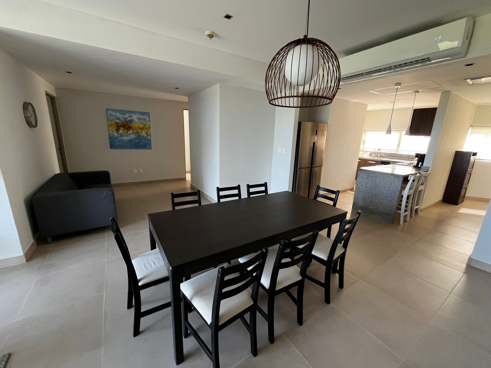 La proporción del área social permite muebles de escala real: un sofá de 3 plazas con chaise, una mesa de comedor para 8, y aún así circular con comodidad. No es un departamento donde hay que elegir entre una sala cómoda o un comedor funcional. Hay espacio para ambos.