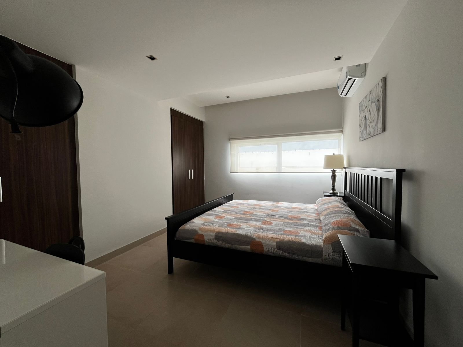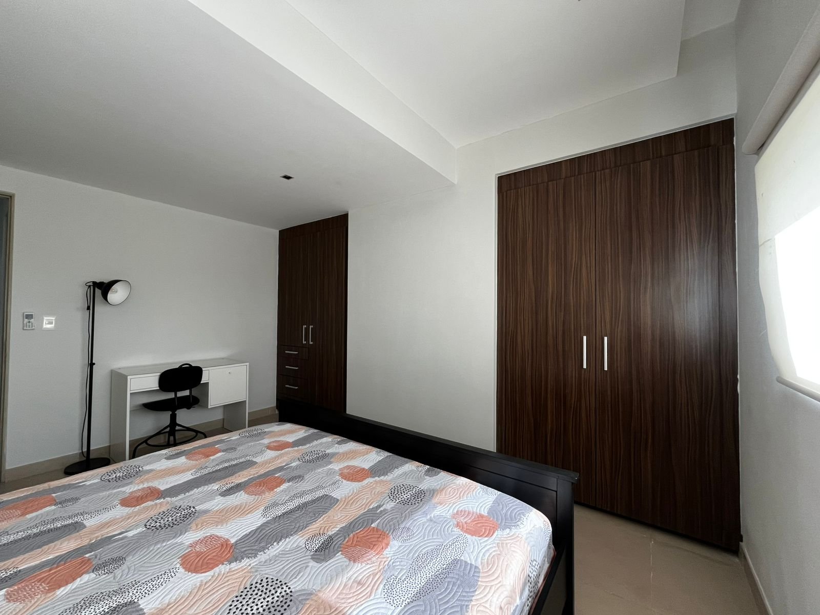 La recámara principal tiene la proporción justa para una cama king, dos burós y un área de vestidor o clóset sin que el espacio se sienta saturado. La orientación en Piso 8 favorece la entrada de luz natural controlada: suficiente para despertar sin alarma en los mejores días, con opción de oscurecer completamente cuando el descanso lo requiere. Es la recámara que justifica el precio por sí sola: privacidad real, silencio de altura y la certeza de que el mundo queda varios pisos abajo.