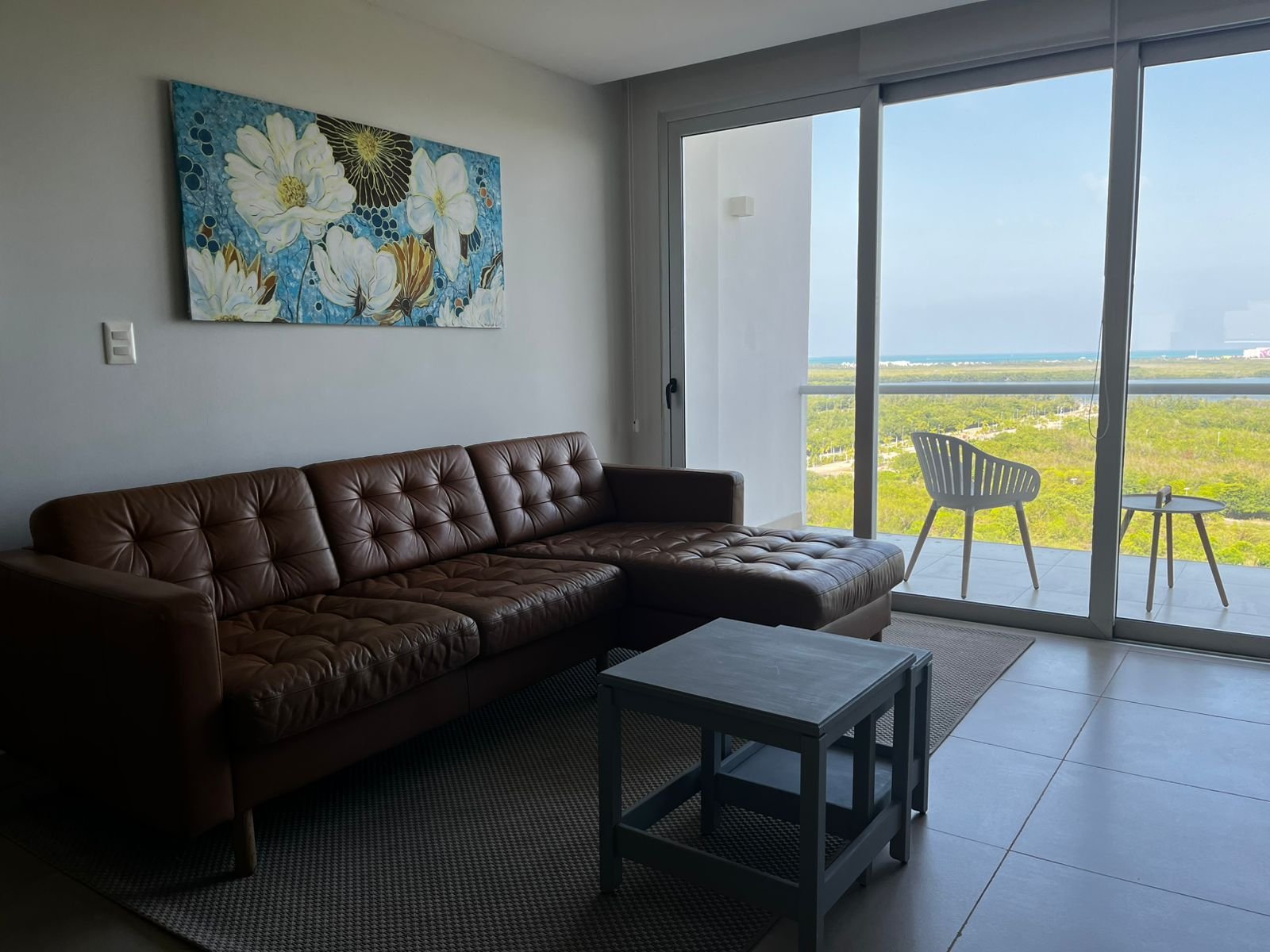 La terraza tiene escala real para una mesa con sillas y un par de sillones, lo que significa que no es un balcón decorativo: es un espacio donde se puede cenar afuera, tomar el desayuno con el horizonte de frente o simplemente quedarse sin hacer nada mientras el viento de la laguna hace su trabajo. Son los metros cuadrados que no aparecen en el contrato pero que se convierten en los más usados del departamento.
